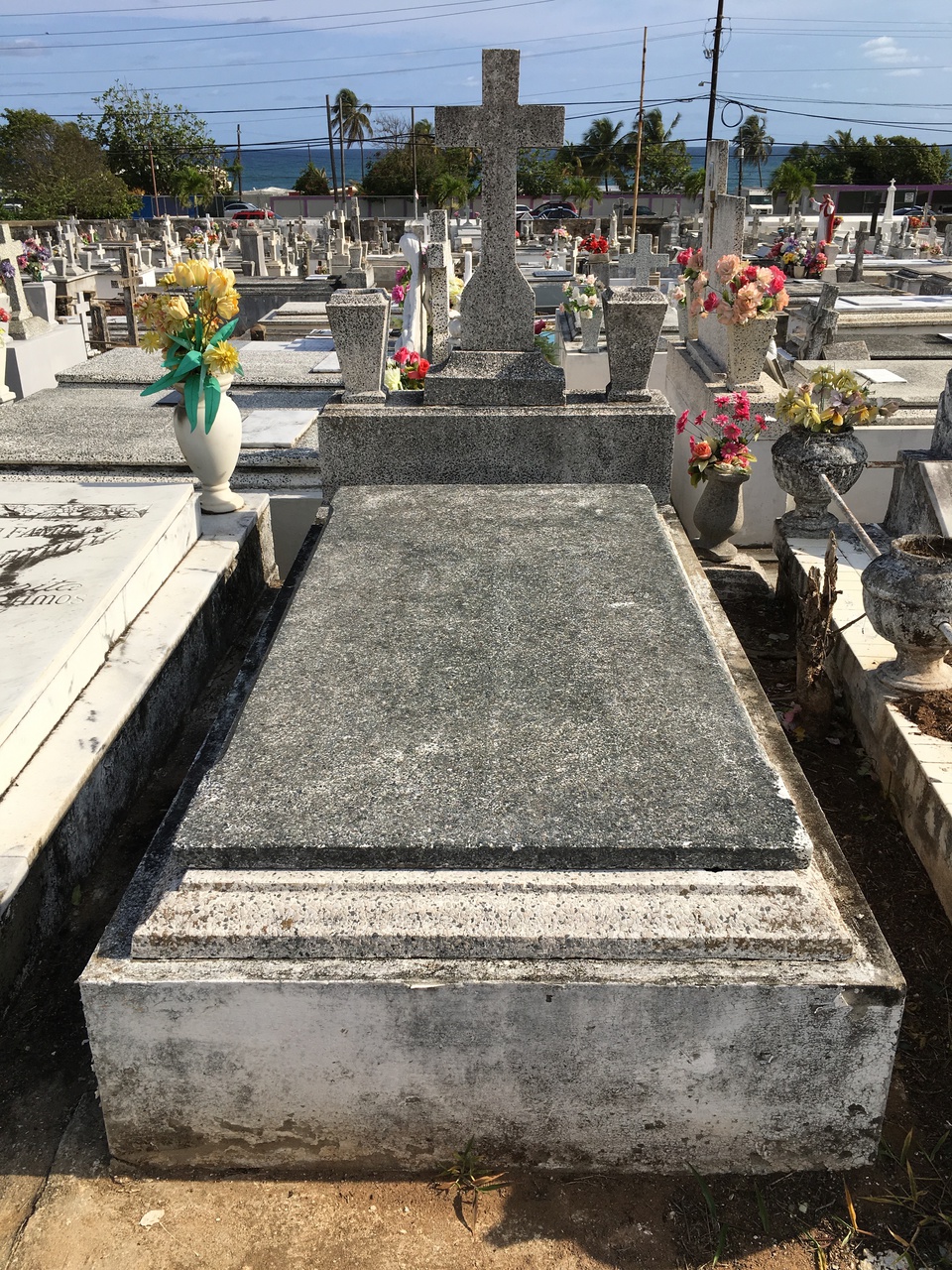 panteon cemento/terrazo, cruz, dos tiestos